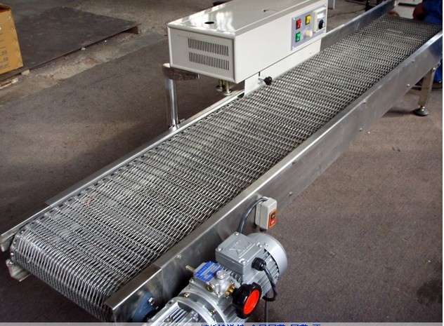 網帶輸送機又叫網帶輸送線,網帶流水線,是一種利用不銹鋼網帶或鏈條式網帶作為承載體的一種輸送機械設備,分網帶式和網鏈式兩種,網帶式是利用滾筒帶動,網鏈式是利用鏈輪帶動。