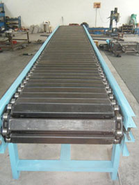 鏈板輸送機采用π型轉彎鏈板作為輸送載體,鏈板運行在高分子聚甲醛制作的專用轉彎導軌里;或使用不銹鋼轉彎鏈板并使用帶磁性的轉彎導軌,使輸送鏈板始終運行在專用導軌里面,具有運行平穩.